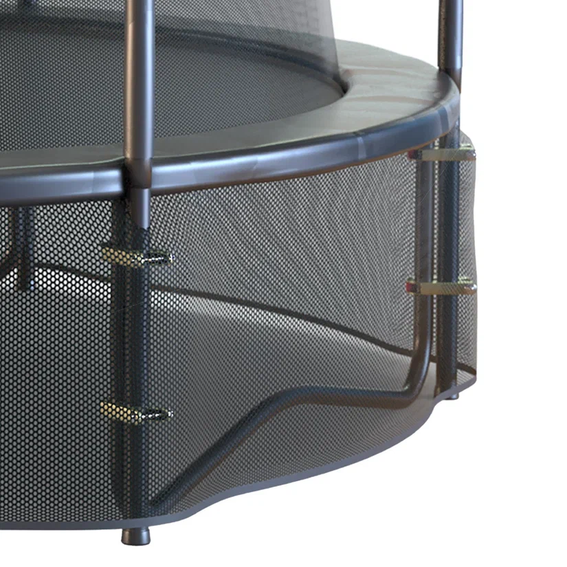 Сетка изготовлена из прочного лавсана с минимальной растяжимостью и высокой износостойкостью. Жесткое верхнее крепление сетки выполнено с использованием соединителей из углеродистого волокна, благодаря чему она всегда остается равномерно натянутой и не провисает - вывалиться с батута физически невозможно. Дополнительную устойчивость конструкции обеспечивают двойные металлические хомуты, которые надежно фиксируют элементы на ножках и делают батут максимально стабильным даже при высокой нагрузке.
