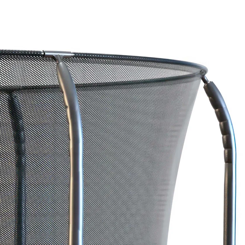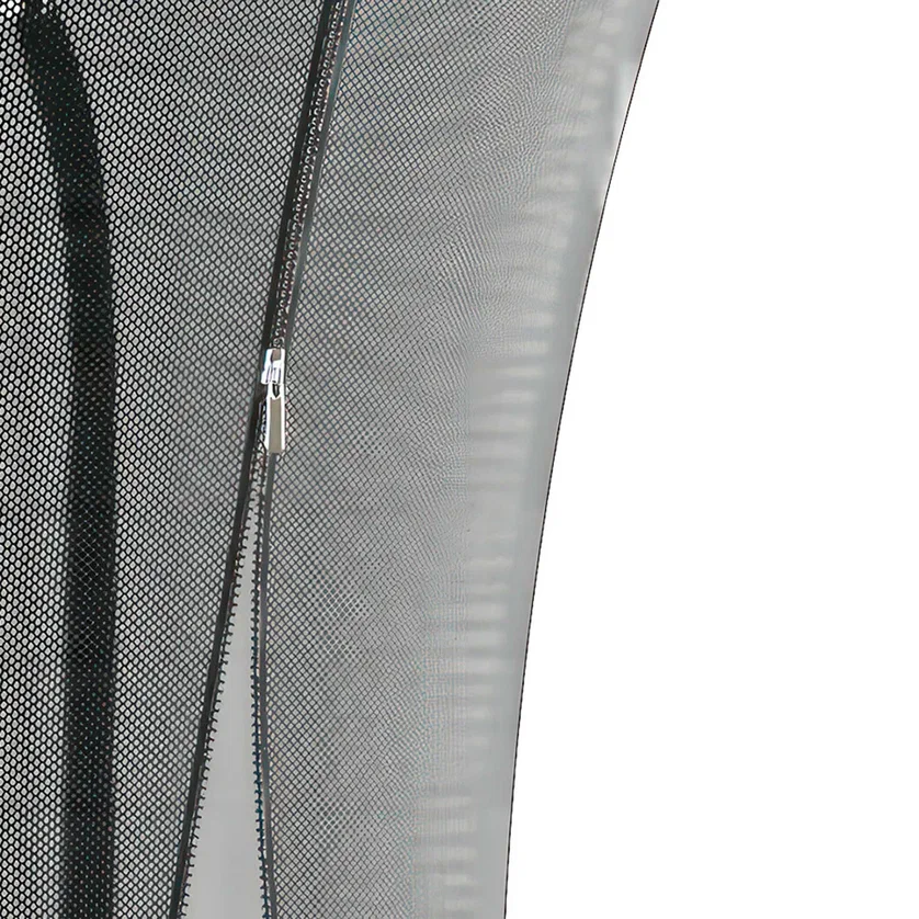 Сетка изготовлена из прочного лавсана с минимальной растяжимостью и высокой износостойкостью. Жесткое верхнее крепление сетки выполнено с использованием соединителей из углеродистого волокна, благодаря чему она всегда остается равномерно натянутой и не провисает - вывалиться с батута физически невозможно. Дополнительную устойчивость конструкции обеспечивают двойные металлические хомуты, которые надежно фиксируют элементы на ножках и делают батут максимально стабильным даже при высокой нагрузке.