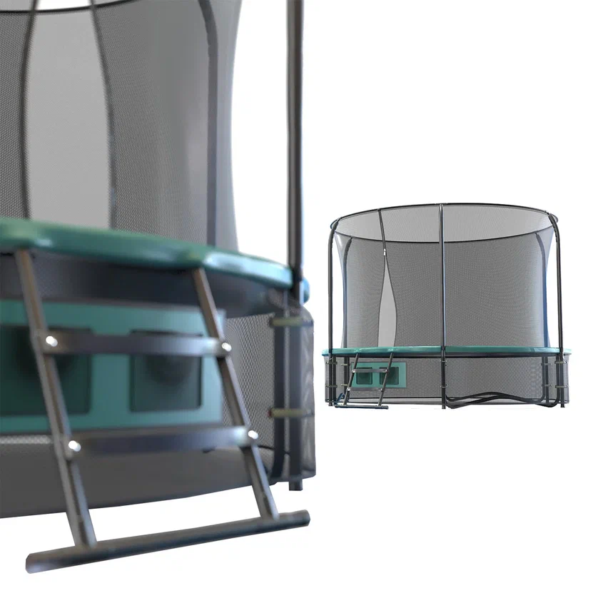 Батут укомплектован удобной двухступенчатой лестницей, которая позволяет легко подниматься на прыжковую поверхность даже детям. На нижней защитной сетке предусмотрена практичная сумка для обуви, благодаря которой кроссовки и тапочки всегда будут под рукой и не потеряются во время активного отдыха.