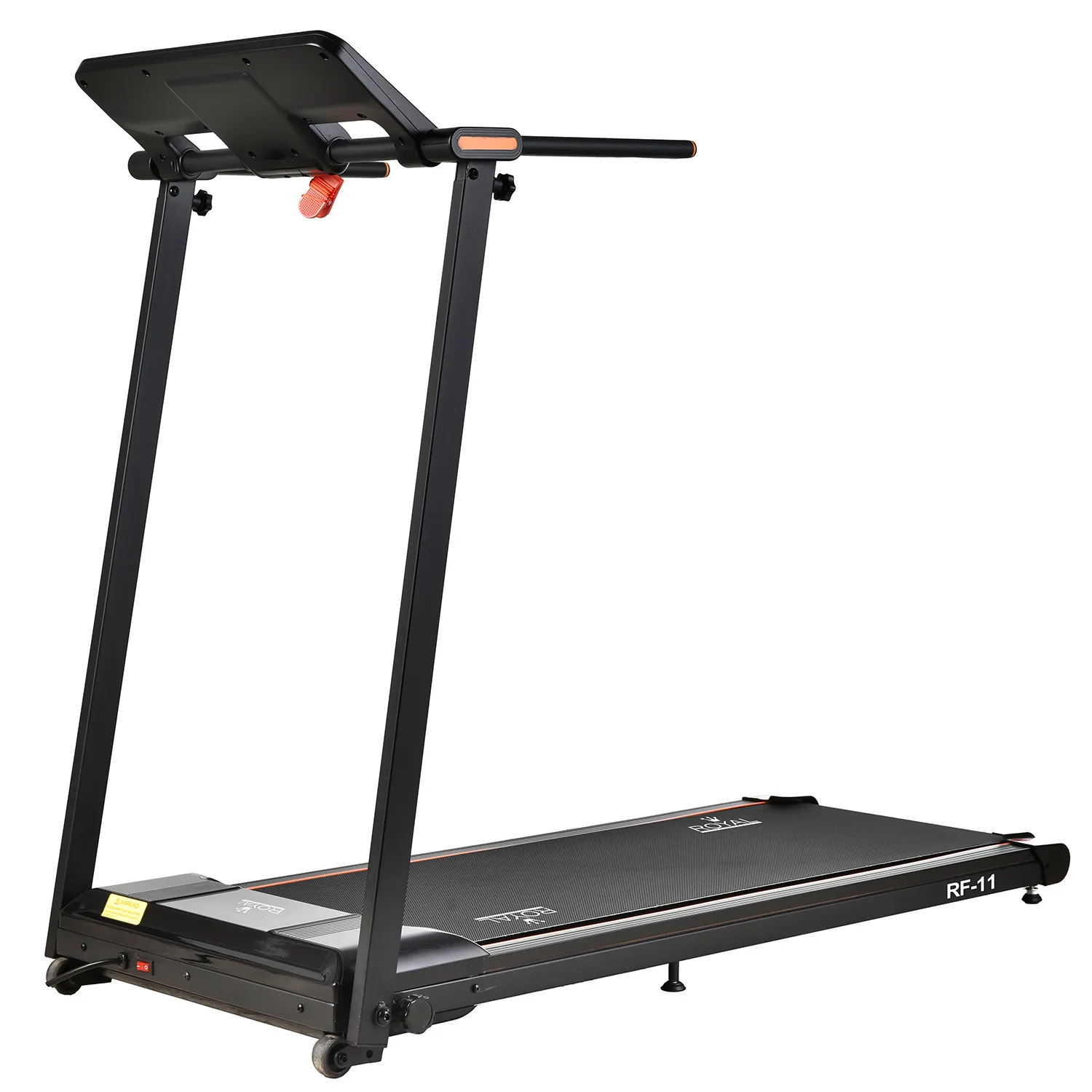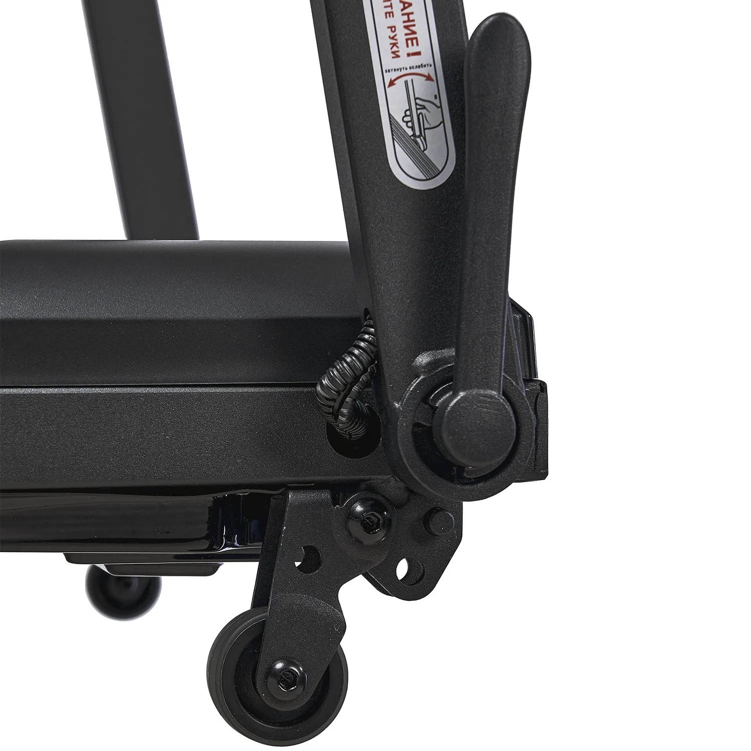 Беговое полотно имеет размеры 100x40 см, и несмотря на компактные размеры позволяет тренироваться пользователям среднего роста. Дорожка оснащена двигателем с низким уровнем шума, который позволяет развить скорость до 10 км/ч, что подойдёт даже пользователям со средним уровнем физической подготовки. Механическая регулировка угла наклона – два уровня, что позволит распределить нагрузку на разные группы мышц.