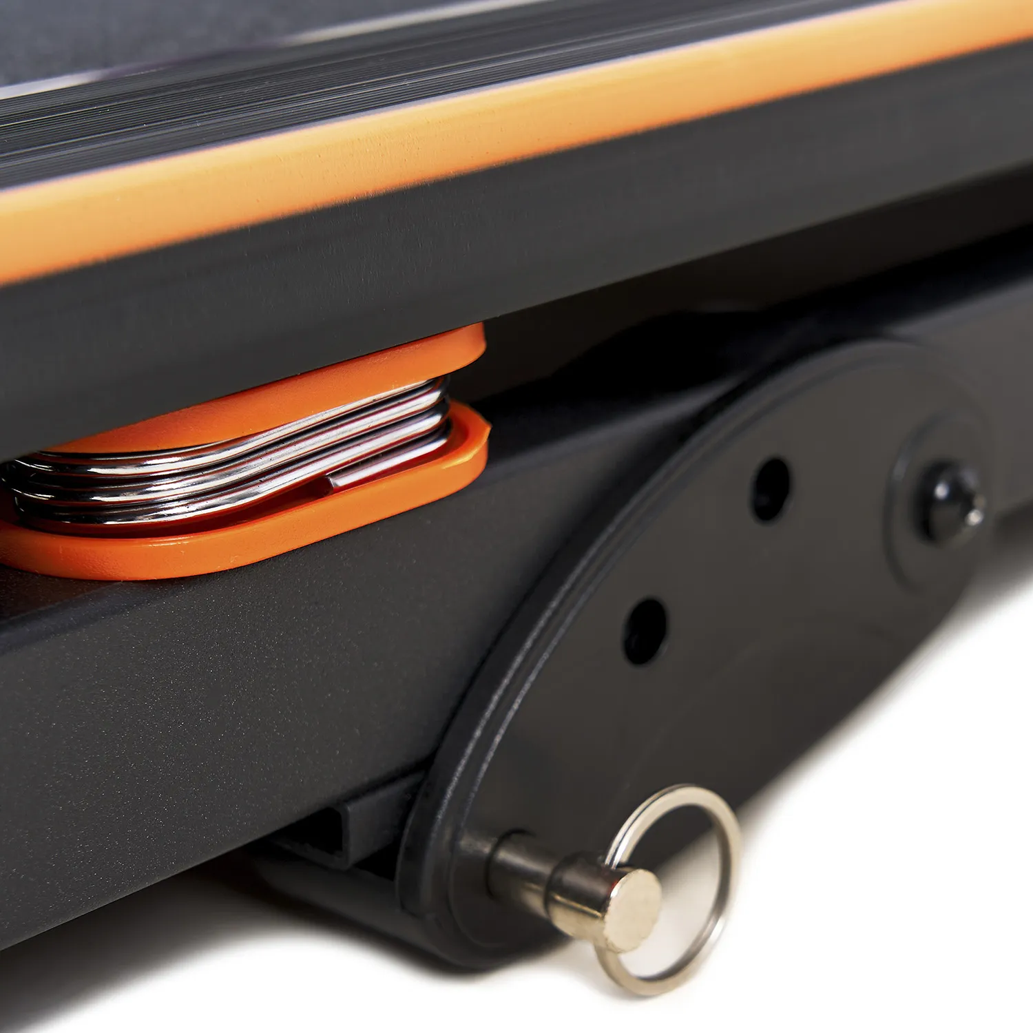 Гидравлическая система складывания «JUST CLICK» существенно облегчает складывание тренажера, а при раскладывании обеспечивает медленное опускание полотна в последней фазе, гарантируя легкость и безопасность. Перемещение дорожки происходит за счет ряда транспортировочных роликов. Рама из высокопрочной стали и усиленные соединения обеспечат долговечность и устойчивость конструкции беговой дорожки. Предельная нагрузка на конструкцию 125 кг.