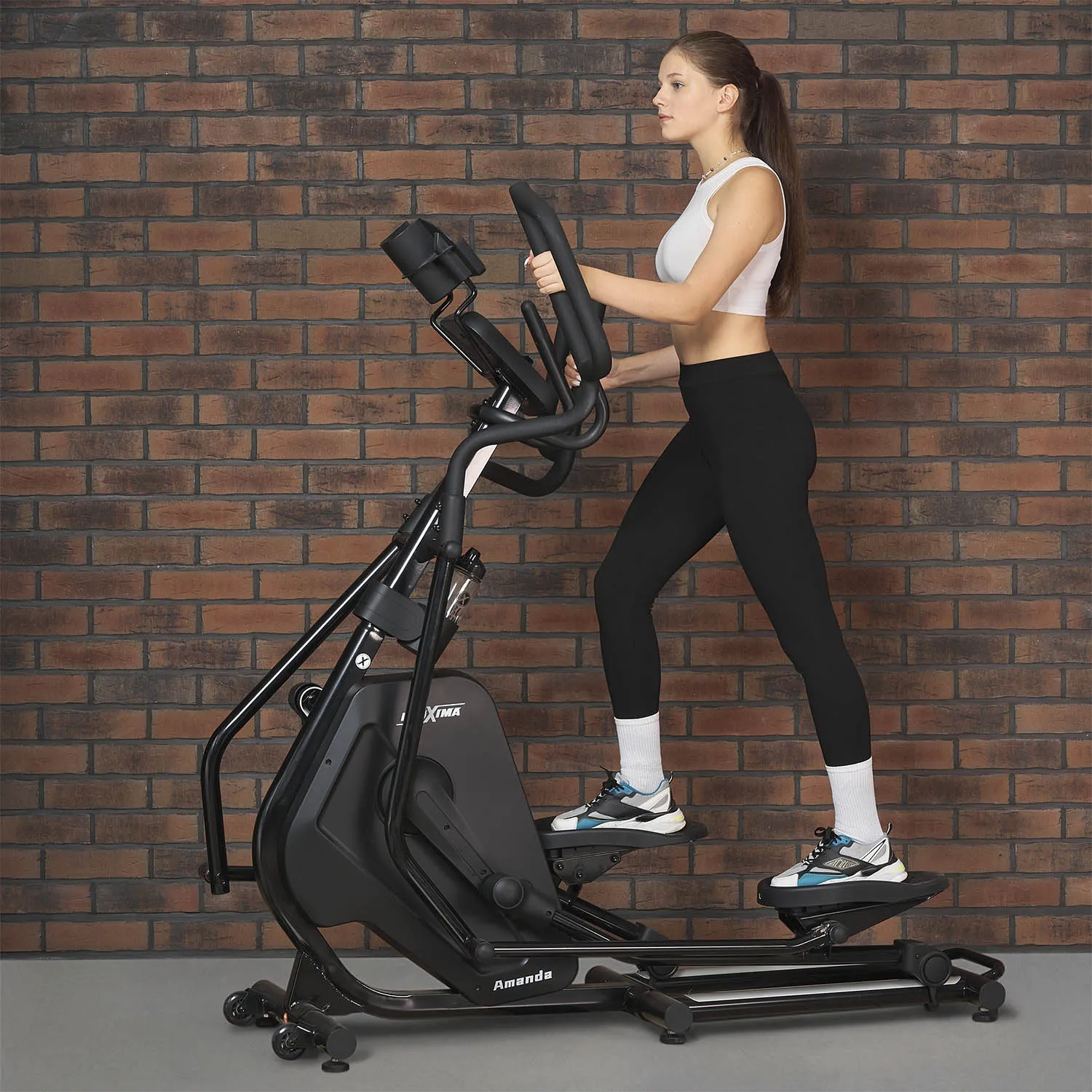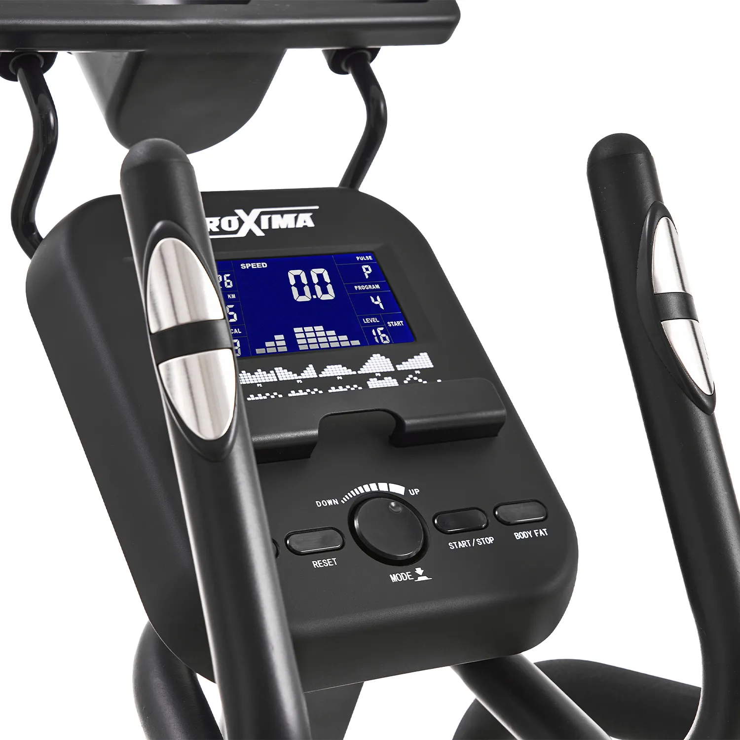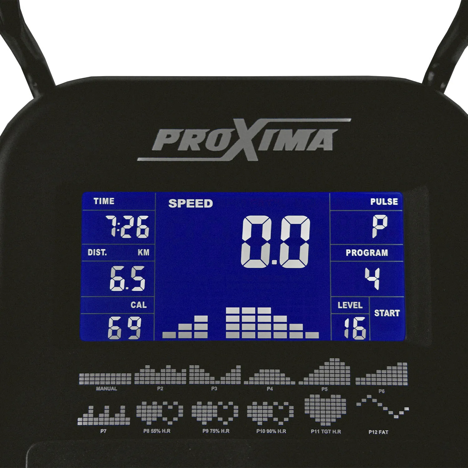 Эллиптический тренажер Proxima Amanda является бюджетной версией переднеприводного эллиптического тренажера с увеличенной длиной шага.