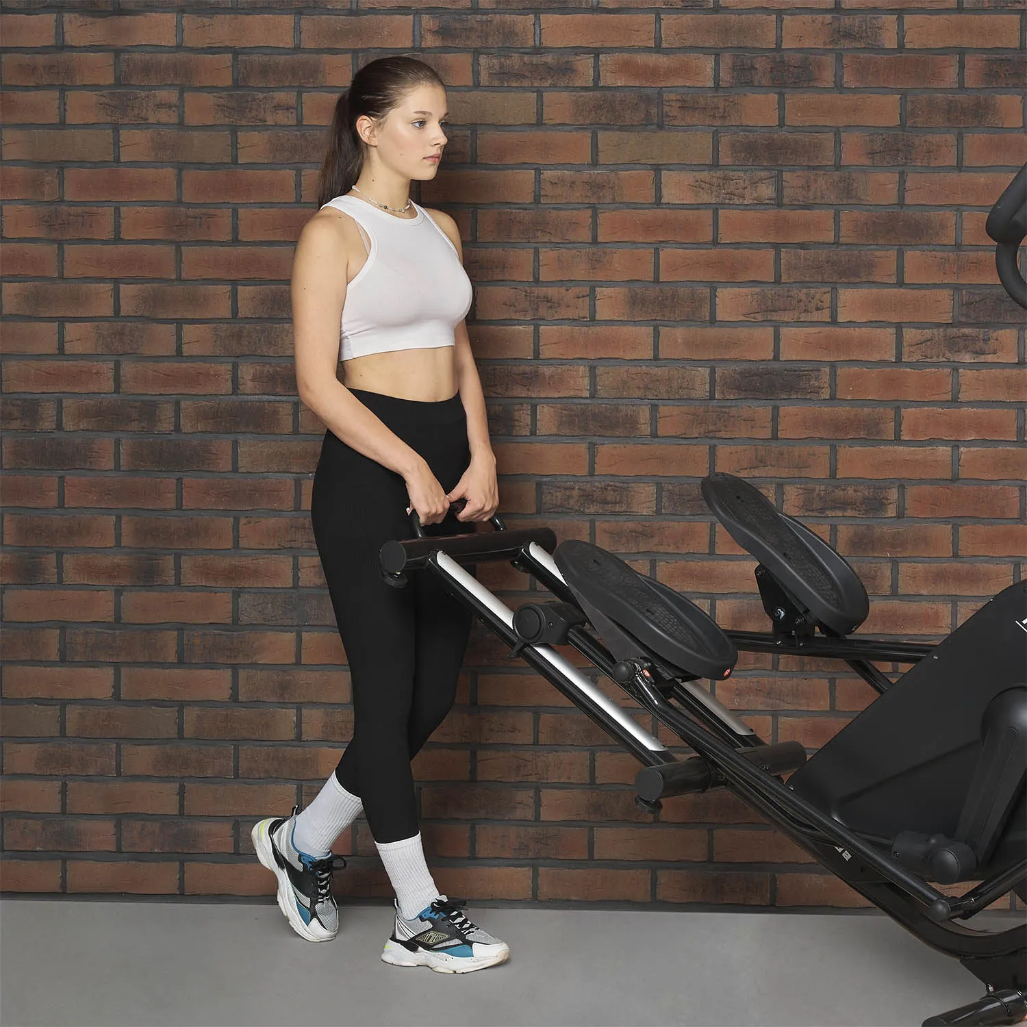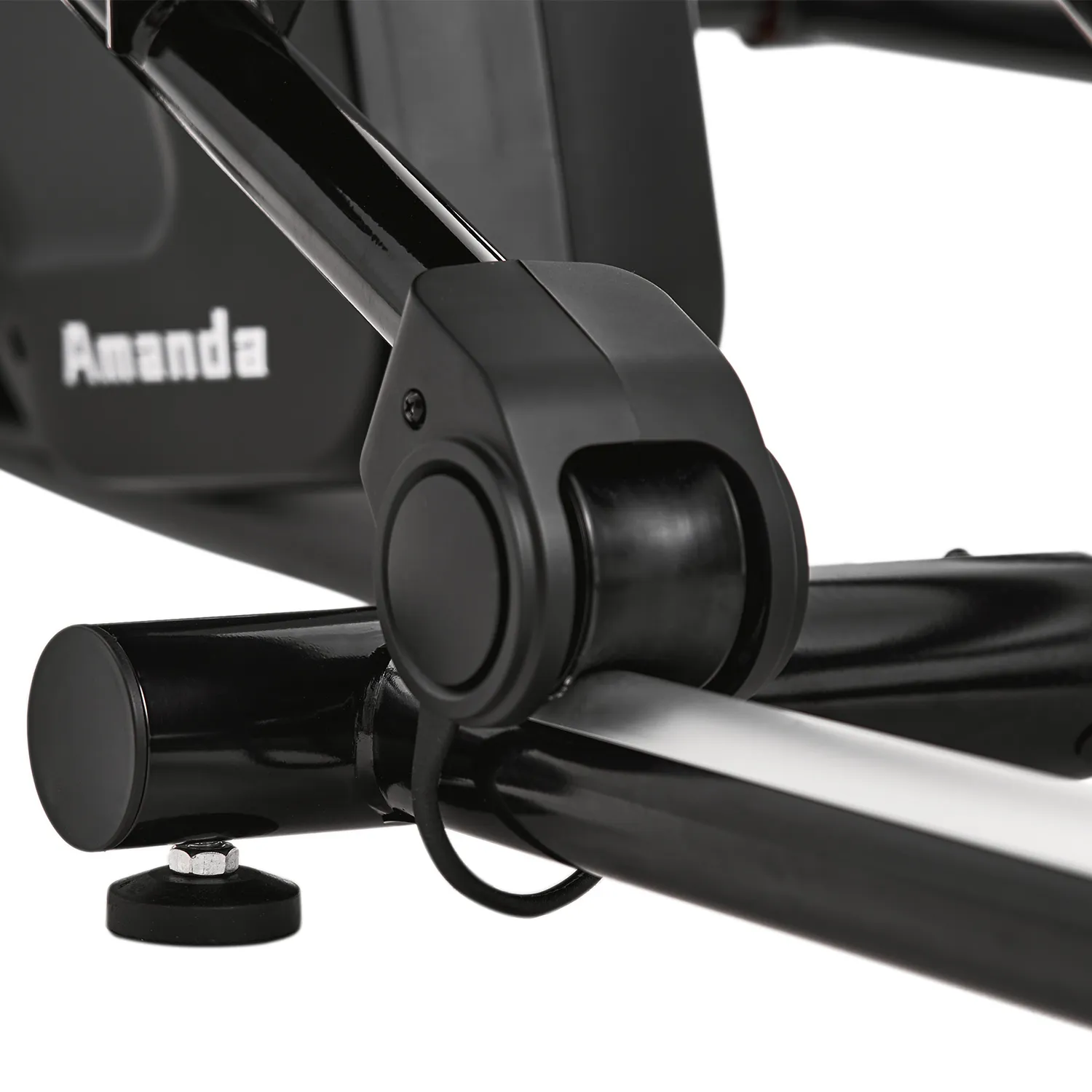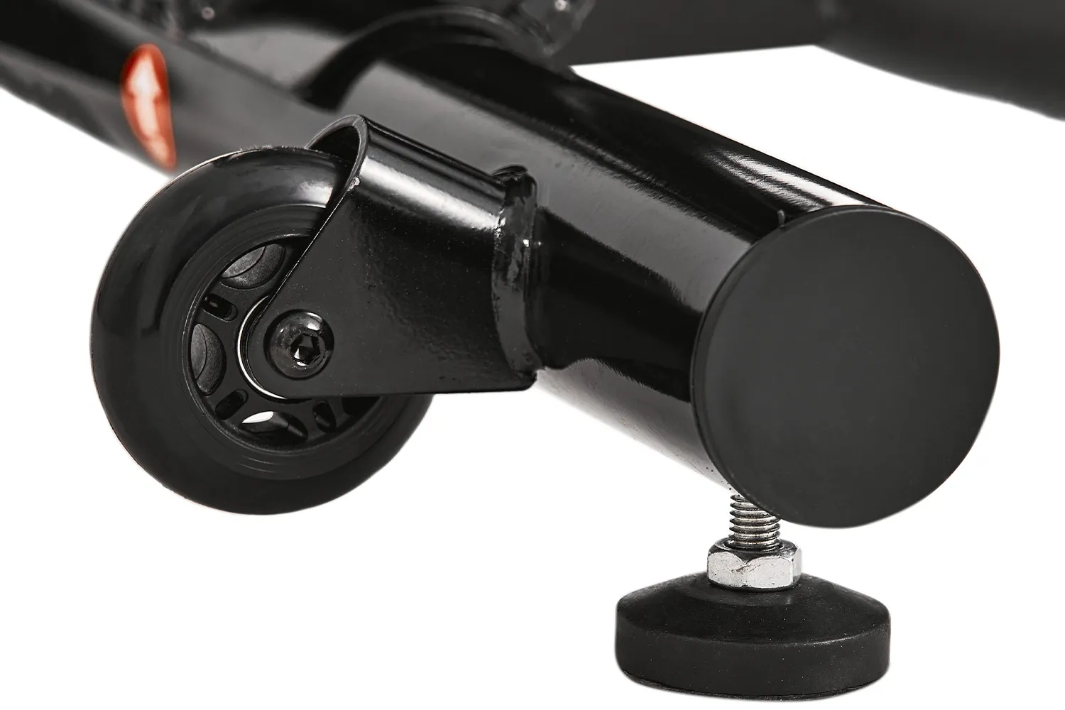 Тренажер оснащен транспортировочными роликами и компенсаторами неровности пола.