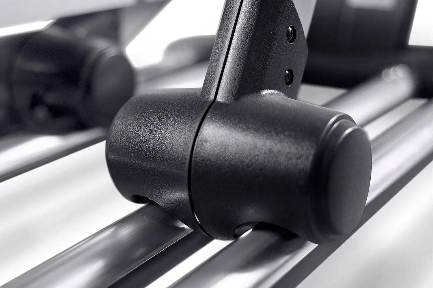 Плавность хода обеспечивается передним приводом и устойчивой конструкцией. Сдвоенные колеса и фронтальные стабилизаторы отвечают за устойчивость — тренажер не раскачивается и не вибрирует даже под нагрузкой. Длина шага 58 см делает движения естественными и комфортными людям разного роста, что особенно важно для длительных занятий.