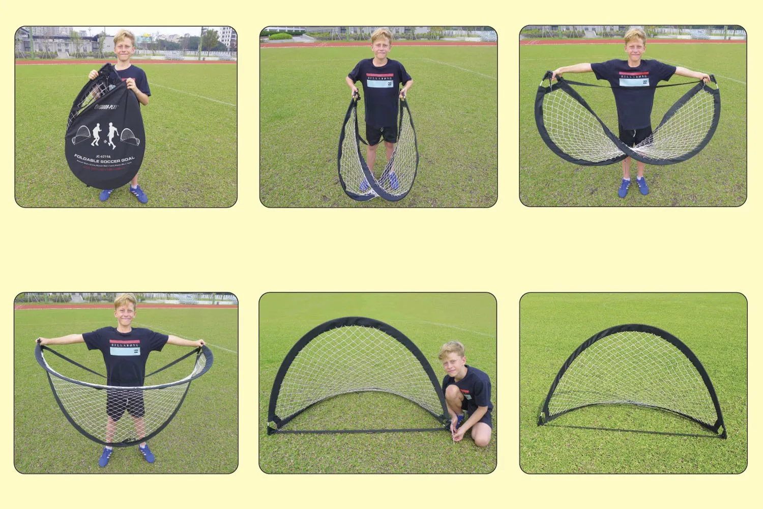 Детские футбольные ворота JC-6219A имеют складную конструкцию. Разбираются/собираются за считанные секунды. Просто расстегните фиксатор и ворота готовы к игре.