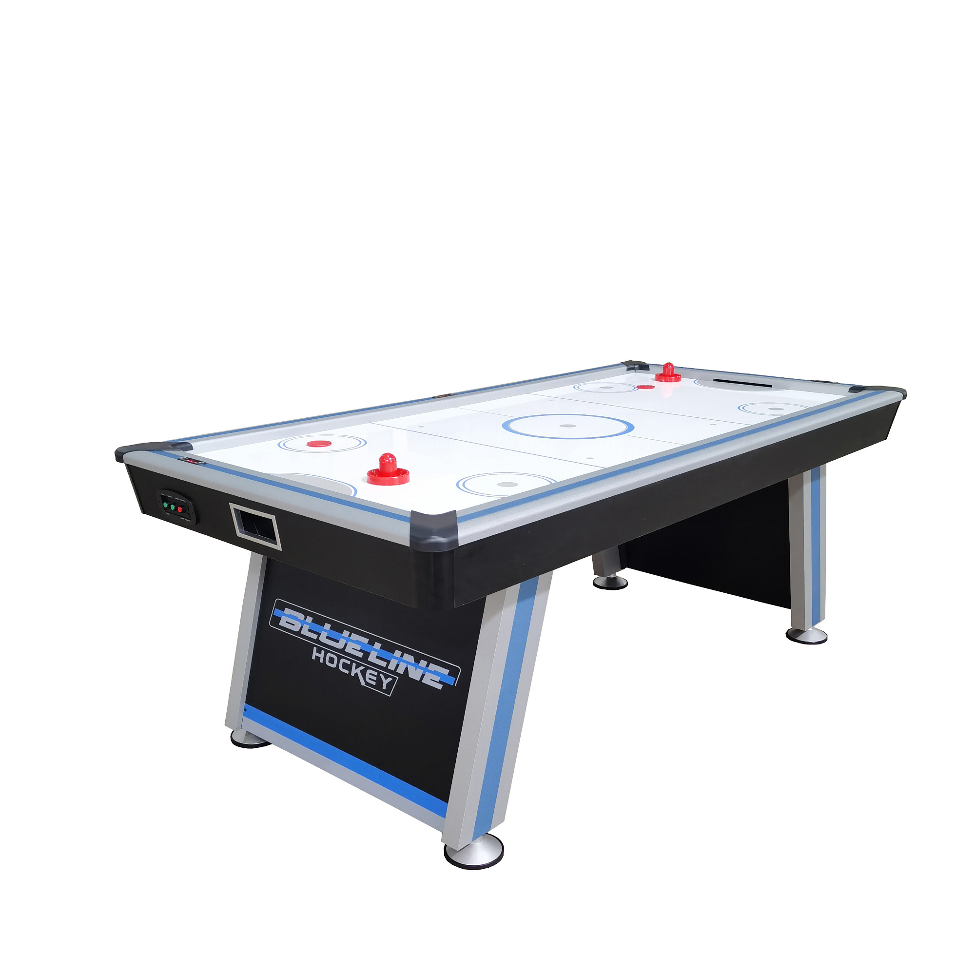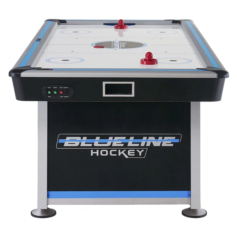 Стол оборудован электронным табло для подсчета очков и комплектуется набором аксессуаров (две биты и две шайбы).